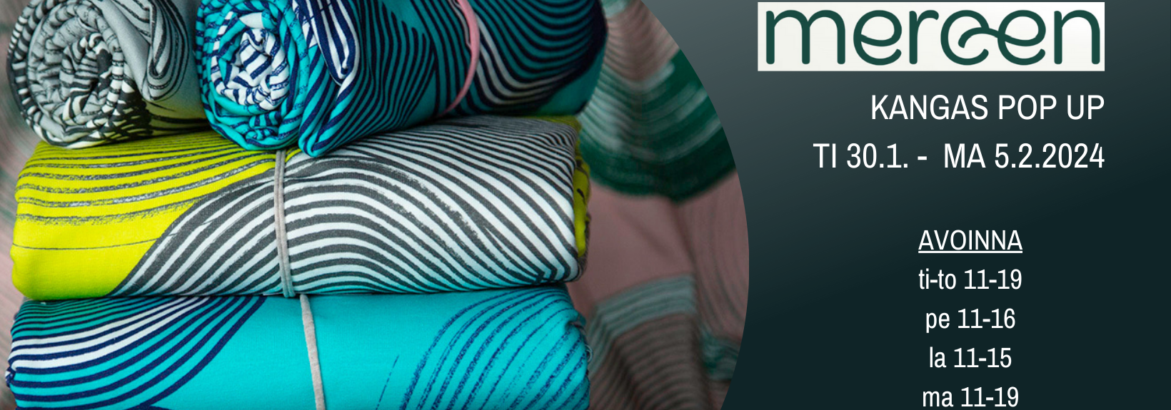 "fi": "<p>Mereen kankaiden Pop Up myynti Seinäjoen taitokeskuksessa ti 30.1. - ma 5.2.</p>\n<p></p>\n<p>Avoinna</p>\n<p>ti-to 11-19</p>\n<p>pe 11-16</p>\n<p>la 11-15</p>\n<p>ma 11-19</p>\n",