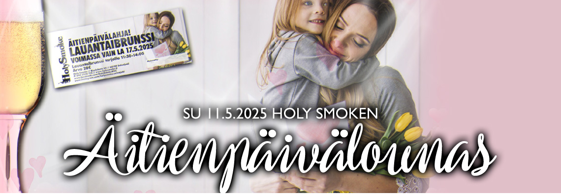 "fi": "<p><h2>Smoken Äitienpäivälounas!</h2></p>\n<p><strong>Hei siellä, mussukat ja mestarimuksut!<br></strong>Nyt nostetaan malja kaikille äideille – sillä ÄITIENPÄIVÄ on pian täällä, ja<br>Holy Smoke laittaa rakkautta pöytään! On aika silittää kauluspaita, nykäistä<br>äiti kainaloon ja suunnata Smokeen - koska sunnuntaina ruokapöytä <strong>notkuu<br>herkuista</strong>, jälkkäripöytä vetää sukat pois jaloista ja fiilis on pehmeämpi kuin äidin halaus.<br><br>Ja koska äiti ansaitsee enemmän kuin pelkän kukkakimpun, meillä on äideille pieni<br>ylläri! <strong>Kaikki ruokailevat äidit saavat lahjaksi lipun Smoken lauantibrunssille!*<br>(Arvo 28€)</strong></p>\n<p>ÄITIENPÄIVÄBRUNSSI SISÄLTÄÄ MM.<br>-Savustettua naudan briskettiä, BBQ-kastike M,G<br>-Bearnaise broileria L,G<br>-BBQ-possua M,G<br>-Smetanalohta L,G<br>-Caesar-salaattia L<br>-Bulgursalaattia L<br>-Smoken perunasalaattia M,G<br>-Välimeren salaattia L,G<br>-Grilliperunat L,G<br>-Kasvisgratiini L,G<br>-Aurakermaperunat L,G<br>-Vegaaninen makaronilaatikko M,G<br><br>LAPSILLE!<br>-Nakkeja M,G<br>-Smoken itsetehtyjä lihapullia M,G<br>-Ranskalaisia M,G<br><br>JÄLKIRUOKAPÖYDÄSSÄ!<br>-Suklaasuihkulähde<br>-Juustopöytä<br>-Tuorejuustokakkua<br>-Mansikkatrifle L,G</p>\n<p>HINTA 39€/hlö*<br>Pienet lapset 1,50€/ikävuosi<br>Äitienpäivälounaan kattaukset 12.00-13.30 sekä 13.45-15.15.<br>Varaukset kattauksille: Puh. 044 2354 113 tai myynti@holysmoke.fi.<br>Voit varata pöydän myös lomakkeella: <a href=\"http://bit.ly/holysmokeyhteydenotto\">http://bit.ly/holysmokeyhteydenotto</a></p>\n<p>_____________________________</p>\n<p>JUOMATARJOUKSET ÄITIENPÄIVÄBRUNSSIN YHTEYDESSÄ:<br><strong>Sielukas talon valkoviini…</strong><br>Holy Smoke WHITE - Chardonnay 19,00€ (norm. 39,50€)<br>75cl, Mendosa, Argentina 13%</p>\n<p><strong>Lasillinen kuohuviiniä…</strong><br>Castellblanc Cava Seco 3,00€ (norm. 8,00€)<br>12cl, Espanja, 11,5%<br><br>SMOKEN LAUANTAIBRUNSSI* -lipun (Arvo 28€, Lippu voimassa la 17.5.2025)<br>Huom! Sunnuntaina 11.5.2025 ei ole voimassa Steak Sunday tarjous.</p>\n",