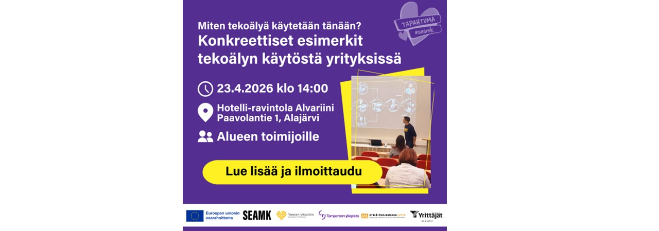 "fi": "Voit osallistua myös etänä. Huom! Tähän ilmoittaudutaan: Jiri.kirsila@seamk.fi tai 040-830 2092. Katso lisää: https://projektit.seamk.fi/yrittajyys-ja-kasvu/co-work/"