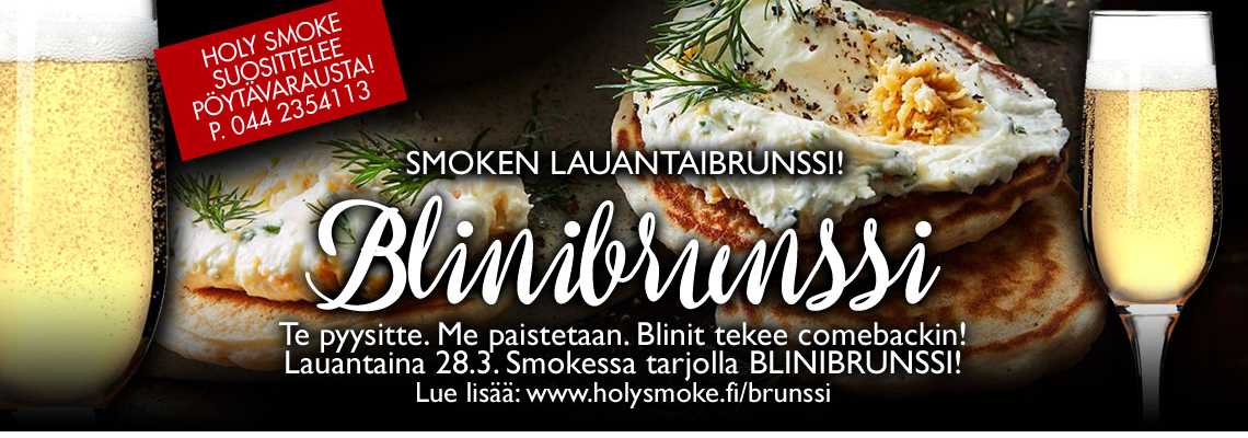 "en": "<p><strong>SAT 28.3. BLINI BRUNCH</strong><br>You asked. We’re cooking. Blini is making a comeback!<br>When the blini stack disappears faster than the weekend, you know something was done right.</p>\n<p>This is the Saturday with no rush. One blini, then another… and then “just one more.” Toppings on point, great company, and a table where the vibe only gets better round after round.</p>\n<p>Gather your crew, book a table, and come see why this one was brought back.<br> <strong>One blini at a time… or a few more. Come. Eat. Repeat.<br> </strong>___________________________________<strong><br>SAT 28.3. BLINI BRUNCH (22€/28€)</strong><br>- Brisket with Jaloviina sauce D,G<br>- Chicken with béarnaise sauce L,G<br>- BBQ meatballs D,G<br>- Sausages D,G<br>- Scrambled eggs L,G<br>- Caesar salad L<br>- Pickles, sour cream and honey<br>- Marinated red onion D,G<br>- Garlic olives D,G<br> <strong>- Butter-fried blinis</strong><br>- Roe mousse L,G<br>- Herring caviar L,G<br>- Smoked salmon mousse L,G<br>- Savory pies L<br>- Smoke’s bread and butter L<br>- Cheese and jam selection<br>- Apple pie L with vanilla sauce<br>- Chocolate fountain & marshmallows<br>- Iced tea<br>- Coffee / tea / cocoa<br>…And plenty more!<br>___________________________________<strong><br>DRINK DEALS DURING BRUNCH:</strong></p>\n<p>Our soulful house white…<br> <strong>Holy Smoke Verdejo 25.00€ (reg. 49.50€)<br> </strong>Portugal, 13%, vegan friendly</p>\n<p>Feeling bubbly?<br> <strong>Holy Smoke Prosecco 4,00€ (reg. 9,00€)</strong><br>12cl, Italy, 11%, vegan friendly</p>\n<p>Brunch drink offers valid until 31.12.2027.</p>\n<p>___________________________________<strong><br>UPCOMING BRUNCHES:</strong><br>4.4. EASTER BRUNCH<br>11.4. MEAT LOVERS BRUNCH<strong><br> </strong>___________________________________</p>\n<p><strong>Facebook fans & Instagram followers: 22€ / person, regular price 28€ / person.<br>Children: 1.5€ per year of age. Brunch served 12:00–14:00.</strong></p>\n<p><strong>Discounted price only for our social media followers – don’t forget to mention it at the register when you arrive! </strong>On Saturdays, regular menu items are available after 12:00.</p>\n<p>And there’s more – with every full-price brunch you get a stamp on your <strong>LUNCH PASS</strong>. Collect 10 and get a <strong>20€ voucher</strong> for Holy Smoke! Grab your pass at the counter – it’s free.<br> <br> <strong>TABLE BOOKINGS:<br> </strong>Drop us a message or give us a call!<br>Puh. <a>+358442354113</a><br>Email: <a href=\"mailto:mailto:myynti@holysmoke.fi\">myynti@holysmoke.fi</a><br>Or use our form: <a href=\"https://bit.ly/holysmokeyhteydenotto\">https://bit.ly/holysmokeyhteydenotto</a></p>\n<p>More info: <a href=\"https://www.holysmoke.fi/brunssi\">https://www.holysmoke.fi/brunssi</a></p>\n<p>Find us here:<br> <a href=\"https://www.facebook.com/HolySmokeBGC\">https://www.facebook.com/HolySmokeBGC</a><br> <a href=\"https://www.instagram.com/holysmoke.seinajoki\">https://www.instagram.com/holysmoke.seinajoki</a><br> <a href=\"https://www.tiktok.com/@holysmokeseinajoki\">https://www.tiktok.com/@holysmokeseinajoki</a></p>\n<p><a href=\"https://www.facebook.com/hashtag/holysmokesein%C3%A4joki?__eep__=6&__cft__%5b0%5d=AZUucTe7e-pRGq-cA5XA_KJYnnoRrrsb9y_w_Y-RkYjAh97K5DoVKWCqNOI5ereZdtrs7uy5LUx6ndDYrJyiPC-U2SdlayZ3iR6R0GvFJjTj689YvErubfChWaXxJ4m_l6YLkMuLrW4h9nc0N4eHabQ0&__tn__=q\"><strong>#holysmokeseinäjoki</strong></a> <a href=\"https://www.facebook.com/hashtag/americanbrunch?__eep__=6&__cft__%5b0%5d=AZUucTe7e-pRGq-cA5XA_KJYnnoRrrsb9y_w_Y-RkYjAh97K5DoVKWCqNOI5ereZdtrs7uy5LUx6ndDYrJyiPC-U2SdlayZ3iR6R0GvFJjTj689YvErubfChWaXxJ4m_l6YLkMuLrW4h9nc0N4eHabQ0&__tn__=q\"><strong>#blinibrunch</strong></a> <a href=\"https://www.facebook.com/hashtag/hyv%C3%A4ruoka?__eep__=6&__cft__%5b0%5d=AZUucTe7e-pRGq-cA5XA_KJYnnoRrrsb9y_w_Y-RkYjAh97K5DoVKWCqNOI5ereZdtrs7uy5LUx6ndDYrJyiPC-U2SdlayZ3iR6R0GvFJjTj689YvErubfChWaXxJ4m_l6YLkMuLrW4h9nc0N4eHabQ0&__tn__=q\"><strong>#blini</strong></a> <a href=\"https://www.facebook.com/hashtag/holysmokebrunssi?__eep__=6&__cft__%5b0%5d=AZUucTe7e-pRGq-cA5XA_KJYnnoRrrsb9y_w_Y-RkYjAh97K5DoVKWCqNOI5ereZdtrs7uy5LUx6ndDYrJyiPC-U2SdlayZ3iR6R0GvFJjTj689YvErubfChWaXxJ4m_l6YLkMuLrW4h9nc0N4eHabQ0&__tn__=q\"><strong>#HolySmokeBrunssi</strong></a> <a href=\"https://www.facebook.com/hashtag/lauantaiherkuttelu?__eep__=6&__cft__%5b0%5d=AZUucTe7e-pRGq-cA5XA_KJYnnoRrrsb9y_w_Y-RkYjAh97K5DoVKWCqNOI5ereZdtrs7uy5LUx6ndDYrJyiPC-U2SdlayZ3iR6R0GvFJjTj689YvErubfChWaXxJ4m_l6YLkMuLrW4h9nc0N4eHabQ0&__tn__=q\"><strong>#Lauantai</strong></a><br> <a href=\"https://www.facebook.com/hashtag/holysmokebrunch?__eep__=6&__cft__%5b0%5d=AZUucTe7e-pRGq-cA5XA_KJYnnoRrrsb9y_w_Y-RkYjAh97K5DoVKWCqNOI5ereZdtrs7uy5LUx6ndDYrJyiPC-U2SdlayZ3iR6R0GvFJjTj689YvErubfChWaXxJ4m_l6YLkMuLrW4h9nc0N4eHabQ0&__tn__=q\"><strong>#HolySmokeBrunch</strong></a> <a href=\"https://www.facebook.com/hashtag/naururaikaa?__eep__=6&__cft__%5b0%5d=AZUucTe7e-pRGq-cA5XA_KJYnnoRrrsb9y_w_Y-RkYjAh97K5DoVKWCqNOI5ereZdtrs7uy5LUx6ndDYrJyiPC-U2SdlayZ3iR6R0GvFJjTj689YvErubfChWaXxJ4m_l6YLkMuLrW4h9nc0N4eHabQ0&__tn__=q\"><strong>#NauruRaikaa</strong></a> <a href=\"https://www.facebook.com/hashtag/visitsein%C3%A4joki?__eep__=6&__cft__%5b0%5d=AZUucTe7e-pRGq-cA5XA_KJYnnoRrrsb9y_w_Y-RkYjAh97K5DoVKWCqNOI5ereZdtrs7uy5LUx6ndDYrJyiPC-U2SdlayZ3iR6R0GvFJjTj689YvErubfChWaXxJ4m_l6YLkMuLrW4h9nc0N4eHabQ0&__tn__=q\"><strong>#visitseinäjoki</strong></a> <a href=\"https://www.facebook.com/hashtag/visitlakeus?__eep__=6&__cft__%5b0%5d=AZUucTe7e-pRGq-cA5XA_KJYnnoRrrsb9y_w_Y-RkYjAh97K5DoVKWCqNOI5ereZdtrs7uy5LUx6ndDYrJyiPC-U2SdlayZ3iR6R0GvFJjTj689YvErubfChWaXxJ4m_l6YLkMuLrW4h9nc0N4eHabQ0&__tn__=q\"><strong>#visitlakeus</strong></a> <a href=\"https://www.facebook.com/hashtag/visitseinajokiregion?__eep__=6&__cft__%5b0%5d=AZUucTe7e-pRGq-cA5XA_KJYnnoRrrsb9y_w_Y-RkYjAh97K5DoVKWCqNOI5ereZdtrs7uy5LUx6ndDYrJyiPC-U2SdlayZ3iR6R0GvFJjTj689YvErubfChWaXxJ4m_l6YLkMuLrW4h9nc0N4eHabQ0&__tn__=q\"><