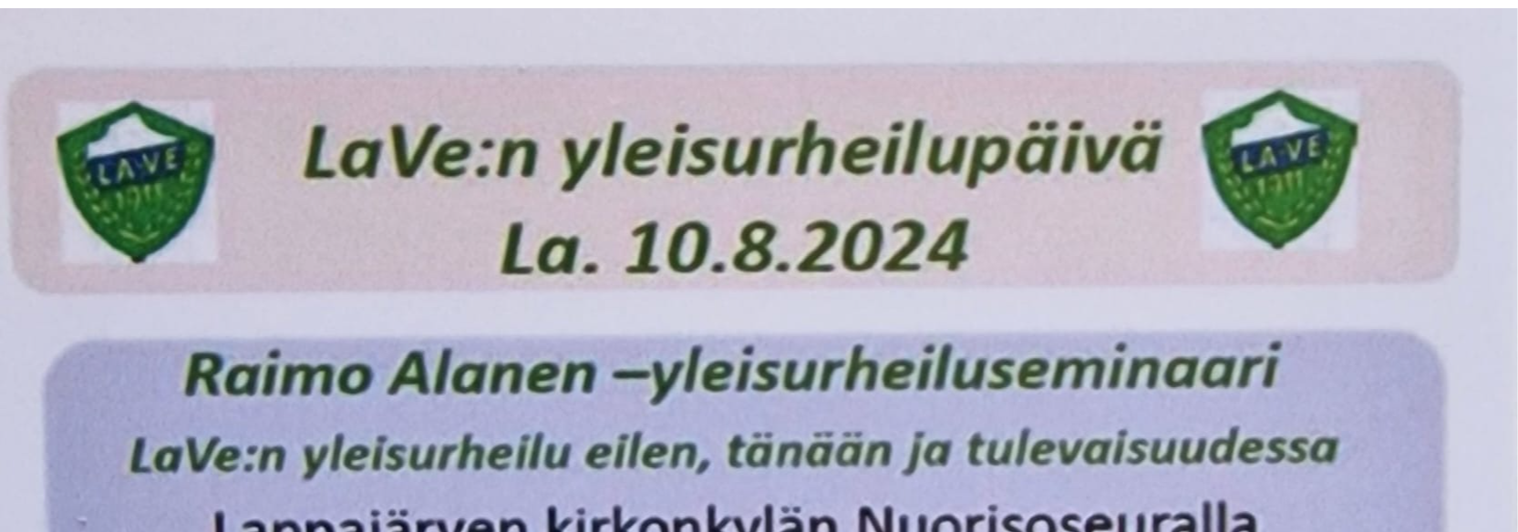 "fi": "<p><strong>Lauantaina 10.8.2024 Yleisurheilupäivä</strong></p>\n<p>Klo 10:00- 12:00 Raimo Alanen yleisurheiluseminaari</p>\n<p>Lappajärven kirkonkylän Nuorisoseuralla</p>\n<p>Aiheena Lave:n yleisurheilu eilen, tänään ja tulevaisuudessa</p>\n<p><strong><ins>Seminaarin ohjelma:</ins></strong></p>\n<p><strong>Teema 1</strong>. Kaksituntia tapaamassa lappajärveläisiä yleisurheilun mestareita sekä juttelua urheilusta</p>\n<p>(kohtaa LaVen mestariurheilijoita teemalla \"miten ennen tultiin urheilijoiksi?\"</p>\n<p><strong>Teema 2.</strong> Terveyttä edistävää liikuntaa ja tulosurheilua -intohimolla</p>\n<p>(Havainnot LaVe:n nykyhetken toiminnasta: mitä vaatii ottaa urheilu tosissaan nykyhetkessä)</p>\n<p><strong>Teema 3.</strong> Fyysisesti aktiivisen elämäntavan rakentaminen ja ylläpito Lappajärvellä</p>\n<p>(LaVen tulevaisuus yleisurheilussa- ja urheilussa yleensä, miten lapsesta liikkuva nuori/urheilija?)</p>\n<p><strong>Teema 4.</strong> Lappajärveläinen yleisurheilu vanhoissa valokuvissa</p>\n<p>.</p>\n<p>.</p>\n<p><strong>Klo: 14:00 alkaen Erkki Ahvenniemen muistokeihäs</strong></p>\n<p>Stadio Nissillä</p>\n<p>Ilmoittautumis linkki keihäskisaan:</p>\n<p>https://www.kilpailukalenteri.fi/?cs=16&nid=34536</p>\n<p><strong>Klo: 15:30 alkaen Arvin avoimet veteraaniurheilukisat</strong></p>\n<p>Stadio Nissillä</p>\n<p>Ilmoittautumis linkki veteraanikisoihin:</p>\n<p>https://www.kilpailukalenteri.fi/?cs=16&nid=34537</p>\n",