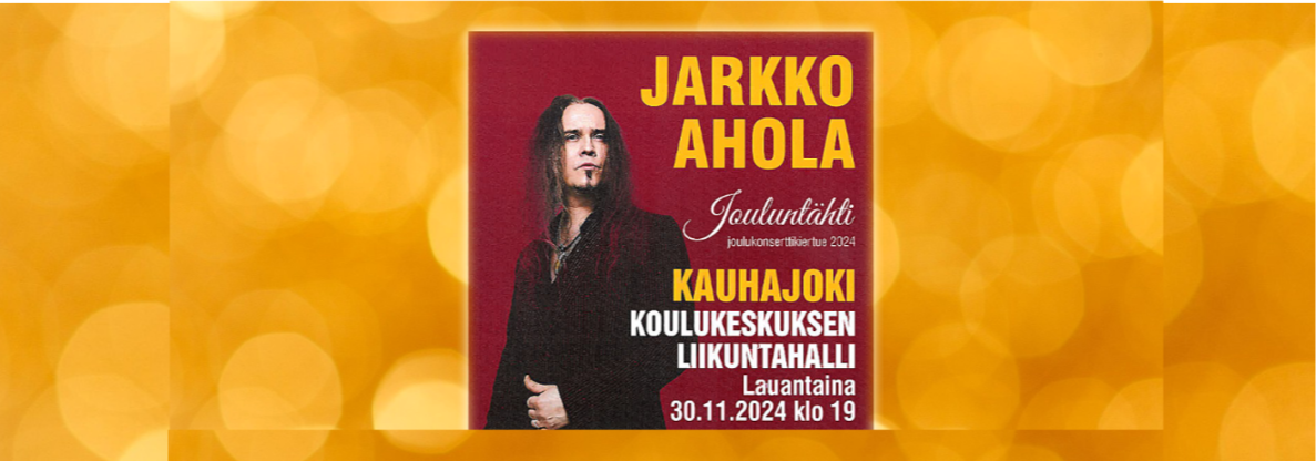 "fi": "<p><strong>Jarkko Ahola esiintyy Kauhajoen Koulukeskuksen liikuntahallissa lauantaina 30.11.2024 klo 19. Liput 39 euroa.</strong></p>\n<p>- Pian on taas se aika vuodesta, kun pääsemme esittämään mahtavia ja lämminhenkisiä joululauluja sekä muuten vain jouluisia kappaleita. Rekemme on luistanut ja rohissut ympäri Suomen jo yli kymmenen vuotta ja aina vaan paranee! Tervetuloa siis mukaan virittäytymään kuusijuhlan ja joulun tähden tunnelmaan kanssamme, <strong>Jarkko Ahola</strong> sanoo.</p>\n<p><strong>Liput : </strong><a href=\"https://www.lippu.fi/event/name-19235503\">https://www.lippu.fi/event/name-19235503</a></p>\n<p><strong>Myynti 39,00 € / konserttilippu:</strong> Veikon Kone Kurikka, Ojalan Pakari Kauhajoki, Citymarketin kahvio, Kauhajoki.</p>\n<p>- Ryhmät yli 30 henkilöä / konserttilippu 30,00 e / hlö (permanto istumapaikoilla) <br>- Varaukset Ryhmät sähköpostitse <a href=\"mailto:lippu@karhubasket.fi\">lippu@karhubasket.fi</a> (tai sähköpostilla <a href=\"mailto:sauli.korpela@gmail.com\">sauli.korpela@gmail.com</a> / puh 0400701511)</p>\n<p>- Liput toimitetaan sopimuksen mukaan<br>- Aulassa narikka (2 euroa/takki) ja klo 18-18.50 avoin Kahvila / kahvin myynti (ryhmävaraus 0500-977889 / Vesa)</p>\n",