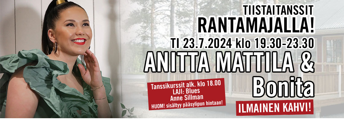 "fi": "<p><strong>TI 23.07.2024 klo 19.30 – 23.30</strong></p>\n<p><strong>ANITTA MATTILA & Bonita</strong></p>\n<p>Vuorotunnit Liput 20 e</p>\n<p>Saarijärventie 276 62420 Kortesjärvi</p>\n<p>Asuntovaunualue järven rannalla !</p>\n<p></p>\n<p>ILMAINEN KAHVI</p>\n<p></p>\n<p>Tanssikurssit alk. klo 18.00</p>\n<p>Laji: blues</p>\n<p>Anne Sillman</p>\n<p>sis. pääsylipun hintaan</p>\n",