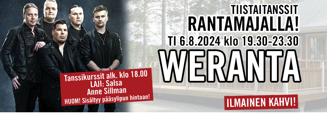 "fi": "<p><strong>TI 06.08.2024 klo 19.30 – 23.30</strong></p>\n<p><strong>WERANTA</strong></p>\n<p>Vuorotunnit Liput 20 e</p>\n<p>Saarijärventie 276 62420 Kortesjärvi</p>\n<p>Asuntovaunualue järven rannalla !</p>\n<p><strong>ILMAINEN KAHVI</strong></p>\n<p>Tanssikurssit alk. klo 18.00</p>\n<p>Laji: salsa</p>\n<p>Anne Sillman</p>\n<p>sis. pääsylipun hintaan</p>\n",