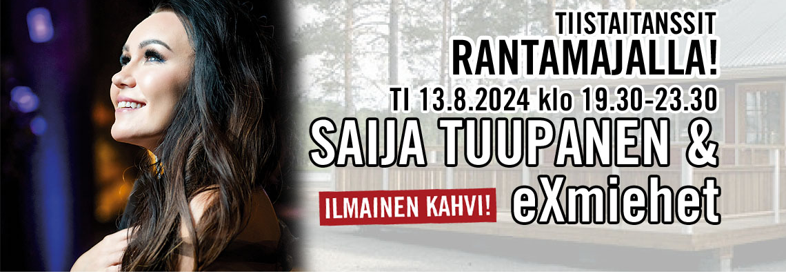 "fi": "<p><strong>TI 13.08.2024 klo 19.30 – 23.30</strong></p>\n<p><strong>SAIJA TUUPANEN & eXmiehet</strong></p>\n<p>Vuorotunnit Liput 20 e</p>\n<p>Saarijärventie 276 62420 Kortesjärvi</p>\n<p>Asuntovaunualue järven rannalla !</p>\n<p>ILMAINEN KAHVI</p>\n",