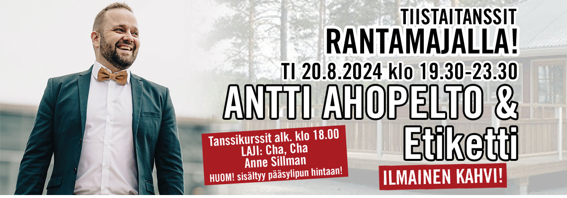"fi": "<p><strong>TI 20.08.2024 klo 19.30 – 23.30</strong></p>\n<p><strong>ANTTI AHOPELTO & Etiketti</strong></p>\n<p>Vuorotunnit Liput 20 e</p>\n<p>Saarijärventie 276 62420 Kortesjärvi</p>\n<p>Asuntovaunualue järven rannalla !</p>\n<p><strong>ILMAINEN KAHVI</strong></p>\n<p>Tanssikurssit alk. klo 18.00</p>\n<p>Laji: cha, cha</p>\n<p>Anne Sillman</p>\n<p>sis. pääsylipun hintaan</p>\n",