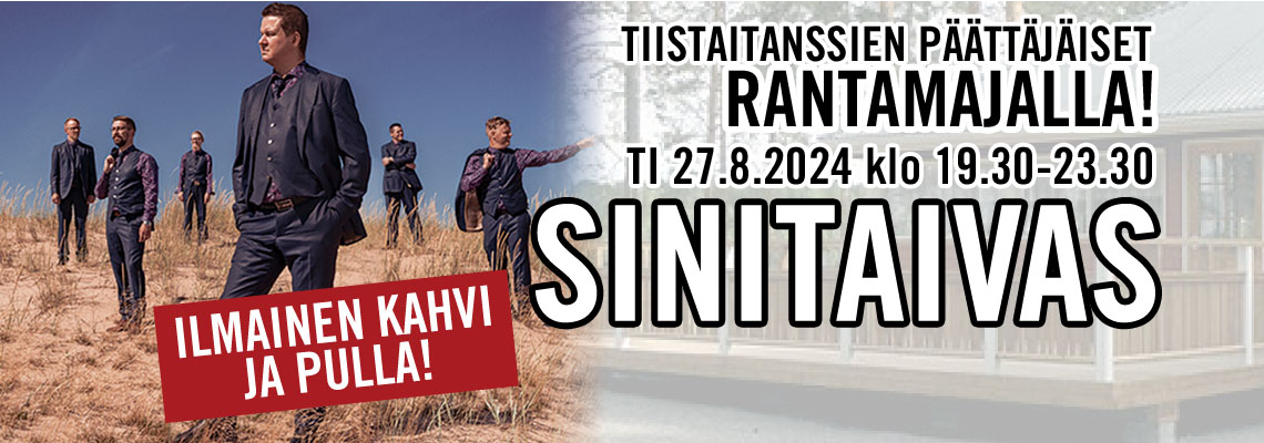 "fi": "<p><strong>Tiistaitanssien</strong></p>\n<p><strong>PÄÄTTÄJÄISET RANTAMAJALLA</strong></p>\n<p><strong>TI 27.08.2024 klo 19.30 – 23.30</strong></p>\n<p><strong>SINITAIVAS</strong></p>\n<p>Vuorotunnit Liput 20 e</p>\n<p>Saarijärventie 276 62420 Kortesjärvi</p>\n<p>Asuntovaunualue järven rannalla !</p>\n<p>ILMAINEN KAHVI JA PULLA</p>\n",