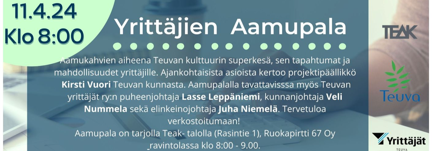 "fi": "<p>Yrittäjien Aamukahvit: Kulttuurin superkesä Teuvalla</p>\n<p>11.4. @ TEAK-talo, klo 8:00 alkaen</p>\n<p></p>\n<p>Tule mukaan kuulemaan Teuvan kesän kulttuuritarjonnasta ja siitä, miten yrityksesi voi olla mukana ja ottaa hyödyn irti tapahtuma kesästä. Tilaisuus on maksuton, avoin kaikille ja ilman ennakkoilmoittautumista – tule mukaan!</p>\n<p></p>\n<p>Mitä odotettavissa:</p>\n<p>Kulttuurin Superkesän esittely: Tutustu kesän kohokohtiin ja yrittäjille tarjolla oleviin mahdollisuuksiin.</p>\n<p>Tarjoamme Ruokapirtti 67 Oy ravintolassa maukkaan aamupalan.</p>\n<p></p>\n<p>Tule kuulemaan, miten voit olla mukana! Tämä on loistava tilaisuus tehdä yrityksesi näkyväksi ja tutustua alueen kulttuuritoimijoihin.</p>\n<p></p>\n<p>#YrittäjienAamukahvit #KulttuurinSuperkesä #Teuva</p>\n",