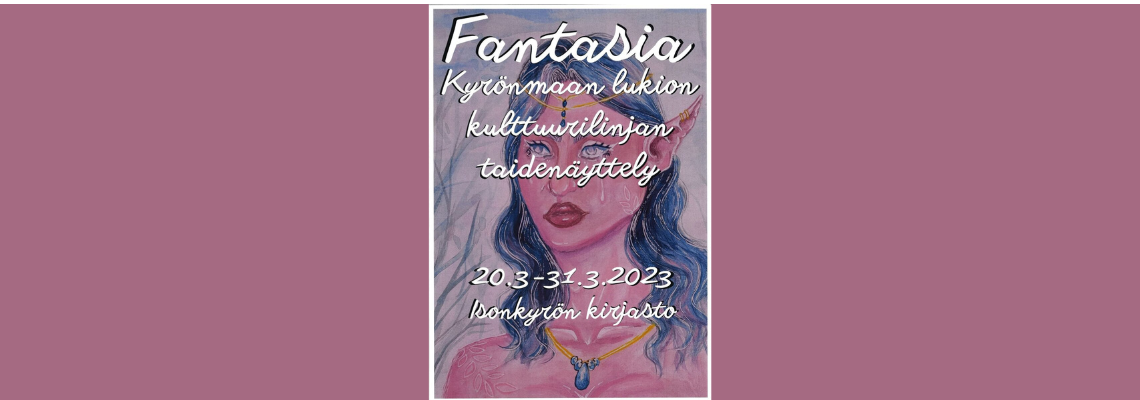 "fi": "<p>Kyrönmaan lukion kulttuurilinja järjestää tämän vuoden produktiona Fantasia-taidenäyttelyn Isonkyrön kirjastolla 20.3.-31.3.</p>\n<p>Produktion aikana valitsimme tämänvuotisen toteutustavan, päätimme taidenäyttelyn teeman ja toteutimme teokset erilaisia tekniikoita hyödyntäen. Lopputuloksesta tulikin upean monipuolinen ja teoksista välittyy tekijöiden mielikuvitus. Tervetuloa tutustumaan!</p>\n<p>Näyttely on auki kirjaston aukioloaikoina ma-to klo 12-19, pe klo 12-17 ja la klo 10-14.</p>\n",