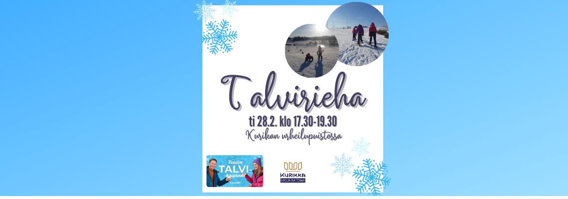 "fi": "Tervetuloa koko perheen maksuttomaan Talviriehaan Kurikkaan kokeilemaan erilaisia aktiviteetteja ulkoilmasta nauttien!",